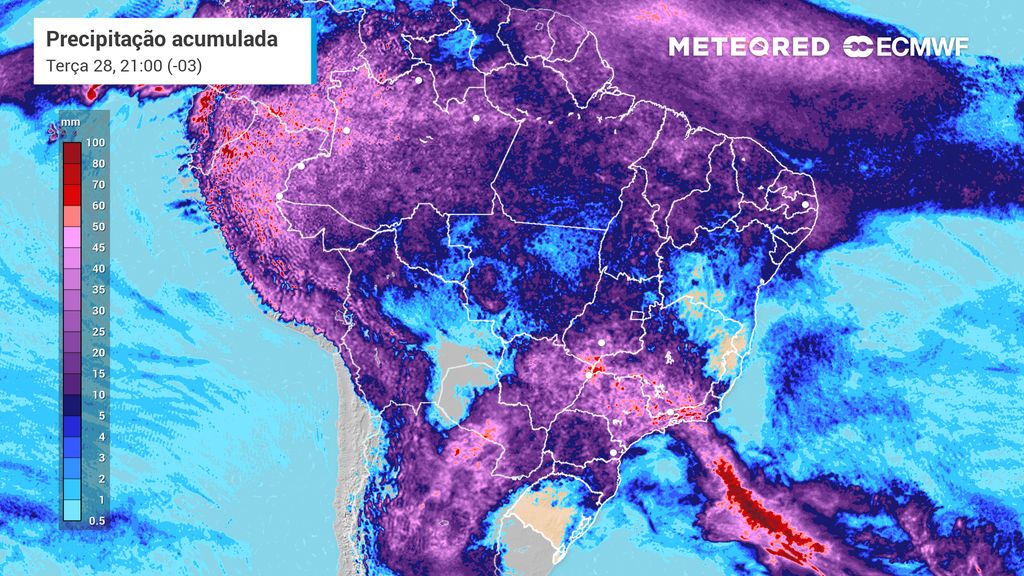 Na terça-feira (28), o cenário é bastante semelhante, mas com redução da chance de chuvas no período da manhã, que acontece somente no Rio de Janeiro e de forma mais pontual sobre o centro-sul de Minas Gerais.