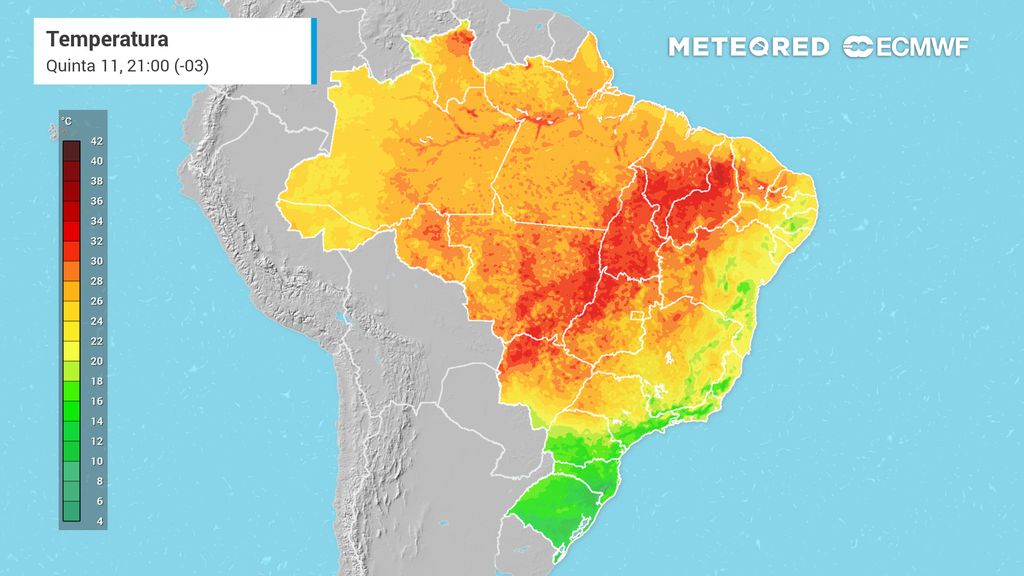 Amanhã (11) será um dos dias mais críticos da semana. As máximas devem superar os 35 °C no Triângulo Mineiro e no oeste paulista. O calor também será intenso no Nordeste, com previsão de temperaturas entre 36 °C e 39 °C no oeste da Bahia e no interior do Maranhão.