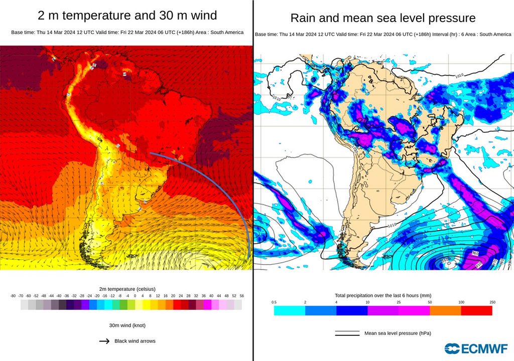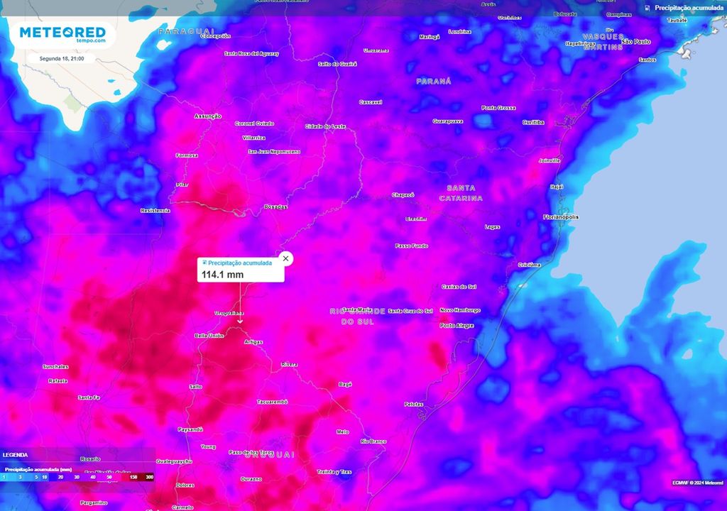 A partir do final desta semana, o modelo do ECMWF indica a formação de uma frente fria que provocará tempo severo no estado do Rio Grande do Sul, onde os acumulados até segunda-feira (18) poderão atingir os 110 mm na divisa do estado com a Argentina e Uruguai. Ainda há a possibilidade de chuvas pontuais e de menor intensidade nos estados de Santa Catarina e Paraná, onde também não é descartado o risco de temporais.