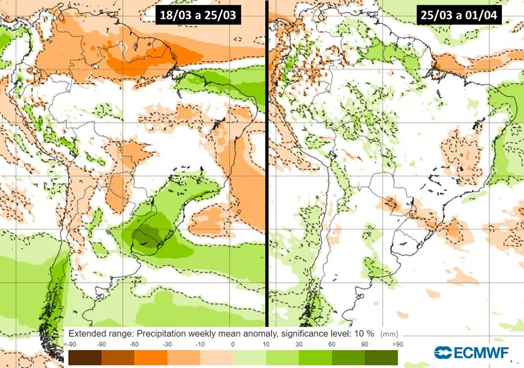 Já na semana dos dias 25 de março a 01 de abril, mesmo sem a presença de um bloqueio atmosférico, o modelo prevê uma redução das chuvas, com acumulados mais próximos à normal climatológica sobre grande parte do Sudeste e Centro-Oeste e chuvas abaixo da média sobre o norte do Rio Grande do Sul e Santa Catarina e também em parte dos estados de Minas Gerais, Bahia e Goiás.