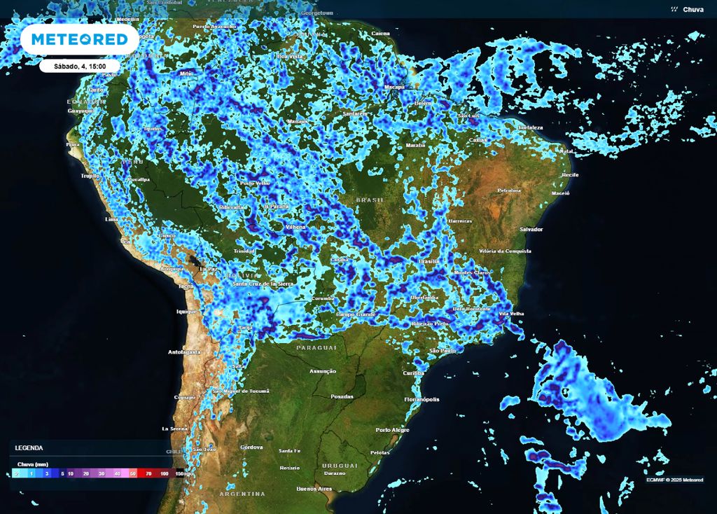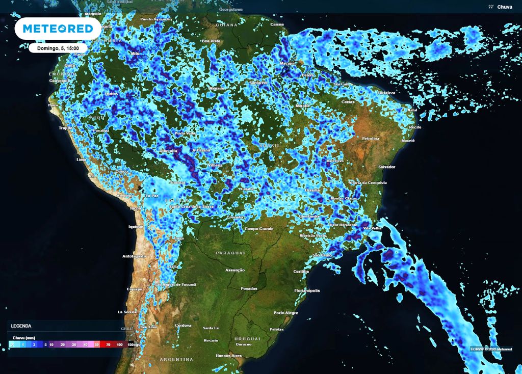 No domingo (05), as chuvas continuam a ocorrer sobre boa parte do Brasil Central, os alertas também devem se manter. Chuvas intensas são esperadas no Vale do Paraíba, em São Paulo, nordeste de Minas Gerais, Espírito Santo, região central do Mato Grosso e Amazonas, além de áreas do oeste de Rondônia.