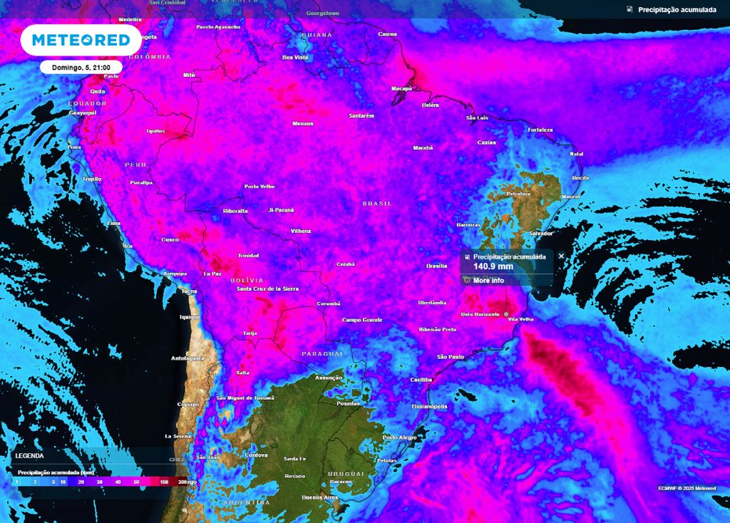 Com o canal de umidade estabelecido sobre o Brasil, o nordeste de Minas Gerais, próximo a divisa com o Espírito Santo, deverá registrar os os maiores valores acumulados de chuva até o final de semana (~140,9 milímetros). O alto volume acumulado poderá causar transtornos.