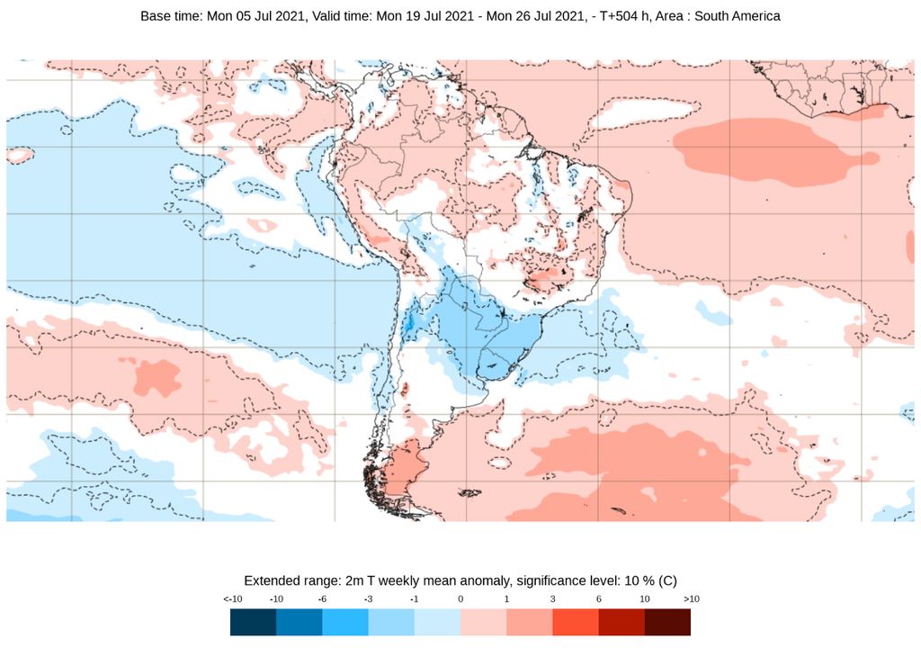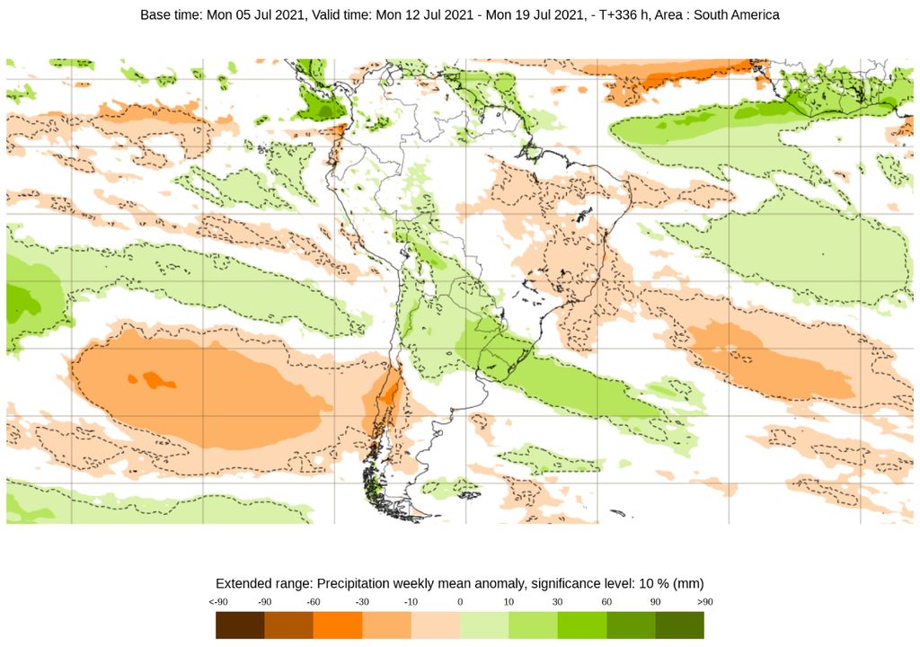 O modelo europeu ECMWF vem apresentando um aumento da umidade na Região Sul a partir da próxima semana, como mostra as anomalias de precipitação do dia 12 ao 19, com tempo mais seco no centro-norte e leste do país.