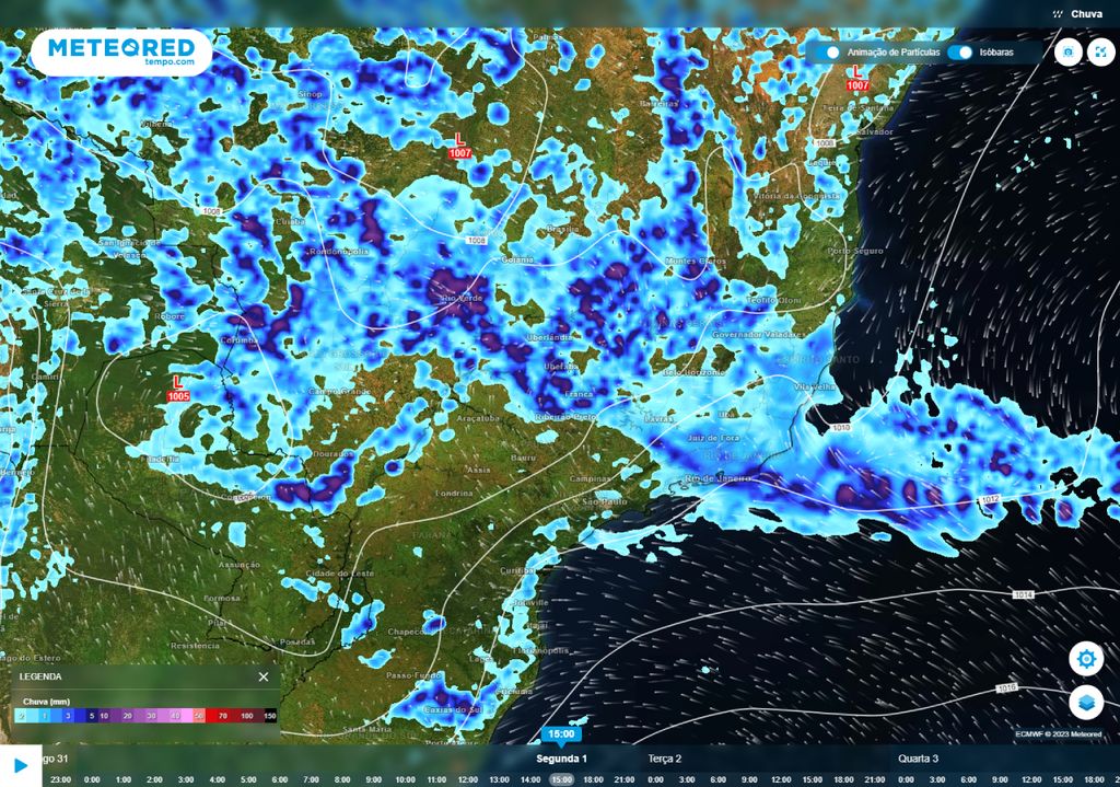 Na segunda-feira (01), o primeiro dia de 2024, uma região de cavado reforça as instabilidades sobre o Sudeste. Chuvas de até forte intensidade, que podem ocorrer de forma muito intensa, ocorrem já no início da manhã no Espírito Santo e no centro-norte de Minas Gerais. Chuvas de mais pontuais ocorrem no restante do território mineiro até o norte e oeste de São Paulo. No Rio de Janeiro até o litoral norte paulista, o tempo continua nublado com previsão de chuvas fraca ou chuvisco.