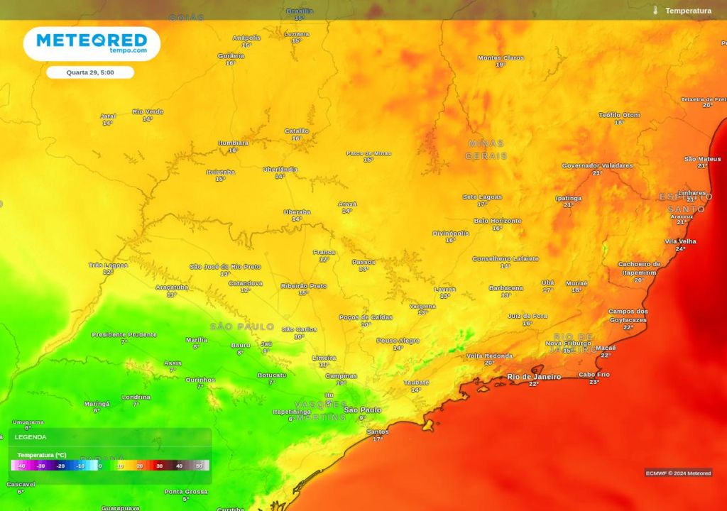 Porém, a queda mais abrupta é esperada na madrugada de quarta-feira (29), quando as temperaturas mínimas poderão ficar abaixo dos 10°C em muitas cidades paulistas! Inclusive, nessa madrugada haverá uma grande diferença de temperaturas entre as cidades paulistas e as demais da região Sudeste. Por exemplo, enquanto cidades como Presidente Prudente e Assis registrarão mínimas de 7°C, cidades como Rio de Janeiro e Cabo Frio estarão registrando mínimas de 22°C e 23ºC, respectivamente.