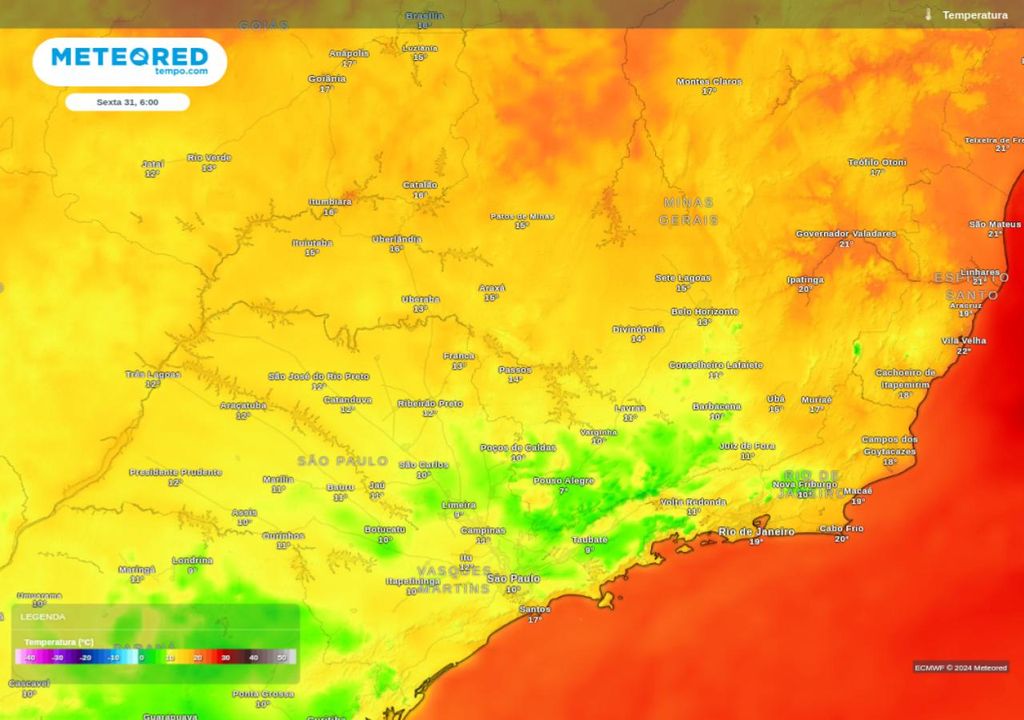 No sul dos estados do Rio de Janeiro e Minas Gerais o frio chegará com mais intensidade entre quarta e quinta-feira, e na porção mais central e norte desses estados o frio será mais intenso a partir de quinta. A cidade de Belo Horizonte deverá registrar uma queda das temperaturas a partir de quinta. Na sexta (31), mesmo com o sol aparecendo, as temperaturas máximas deverão ficar entorno de 25°C e as mínimas entre 12 e 13°C.