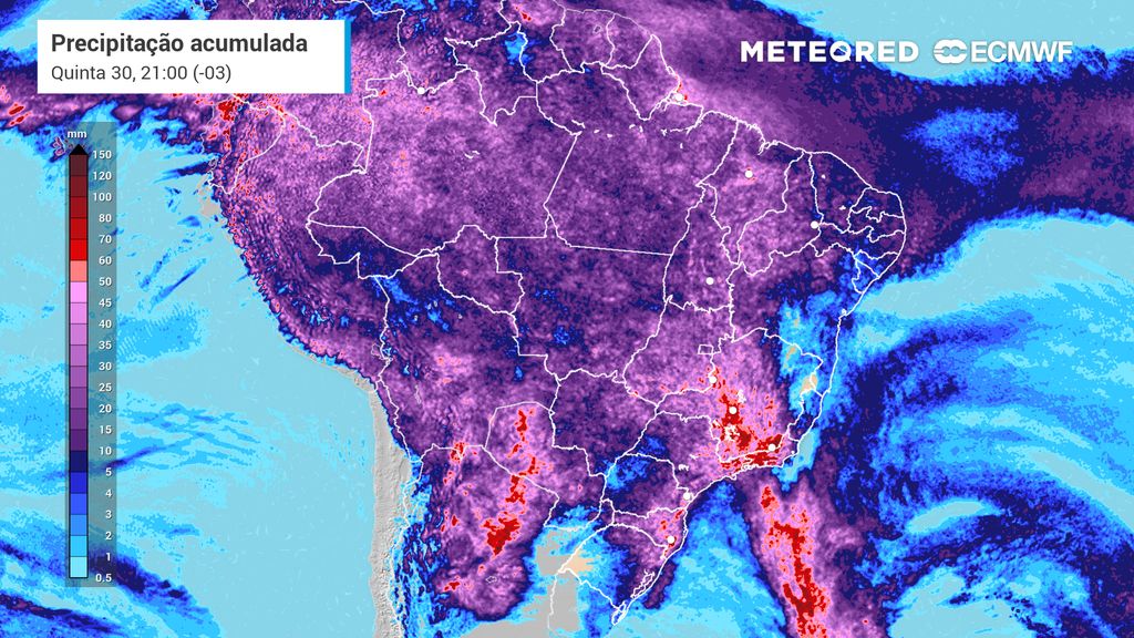 No Centro-Oeste, especialmente em Goiás, Sudoeste do Mato Grosso e norte do Mato Grosso do Sul, os acumulados totais ficarão em torno de 100 a 150 mm de chuva até o domingo (02).