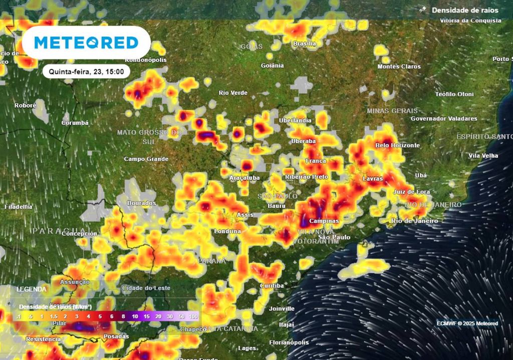 Essas chuvas podem acontecer em forma de pancadas de chuva forte e vir acompanhadas por tempestades, que podem ser severas, especialmente no final da tarde, em áreas do interior paulista, como a região de Campinas, de Bauru e de Ribeirão Preto. No extremo sul do Rio de Janeiro, também há riscos de tempestades localizadas.