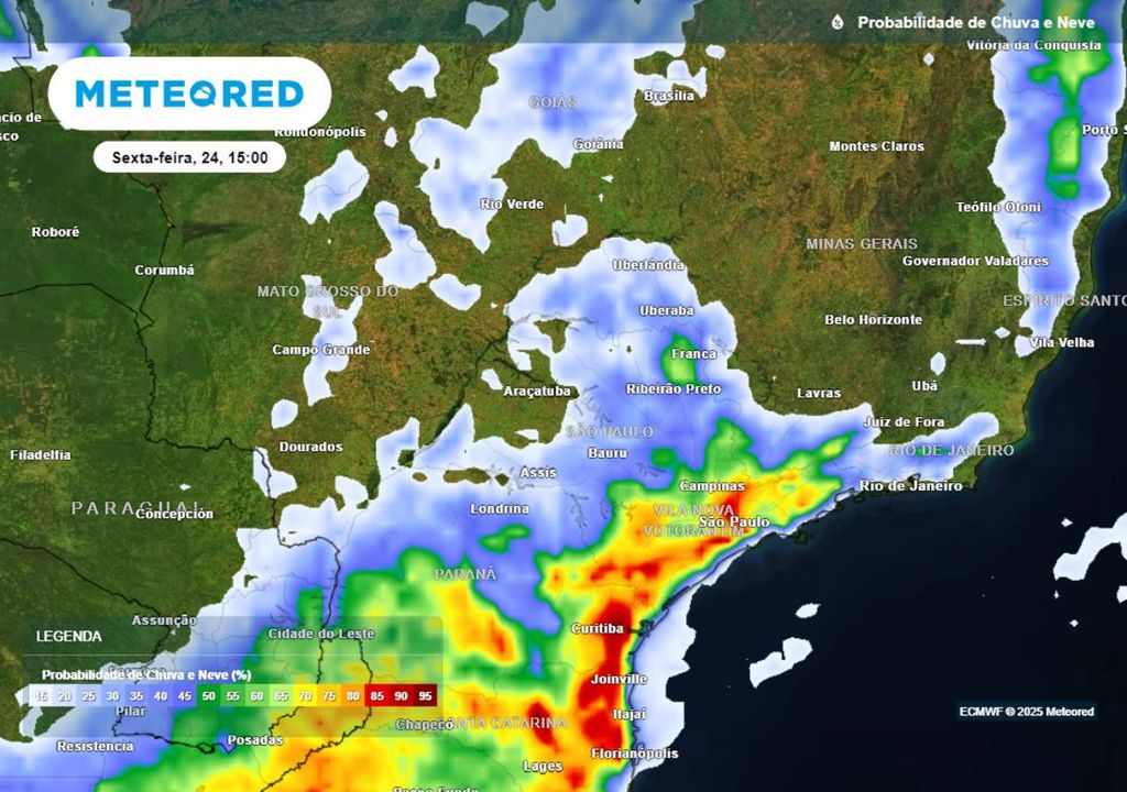 No período da tarde desta sexta-feira (24), a probabilidade de ocorrência de chuvas aumenta em praticamente todo o estado de São Paulo, principalmente na faixa litorânea e no leste paulista, e na metade sul do Rio de Janeiro.