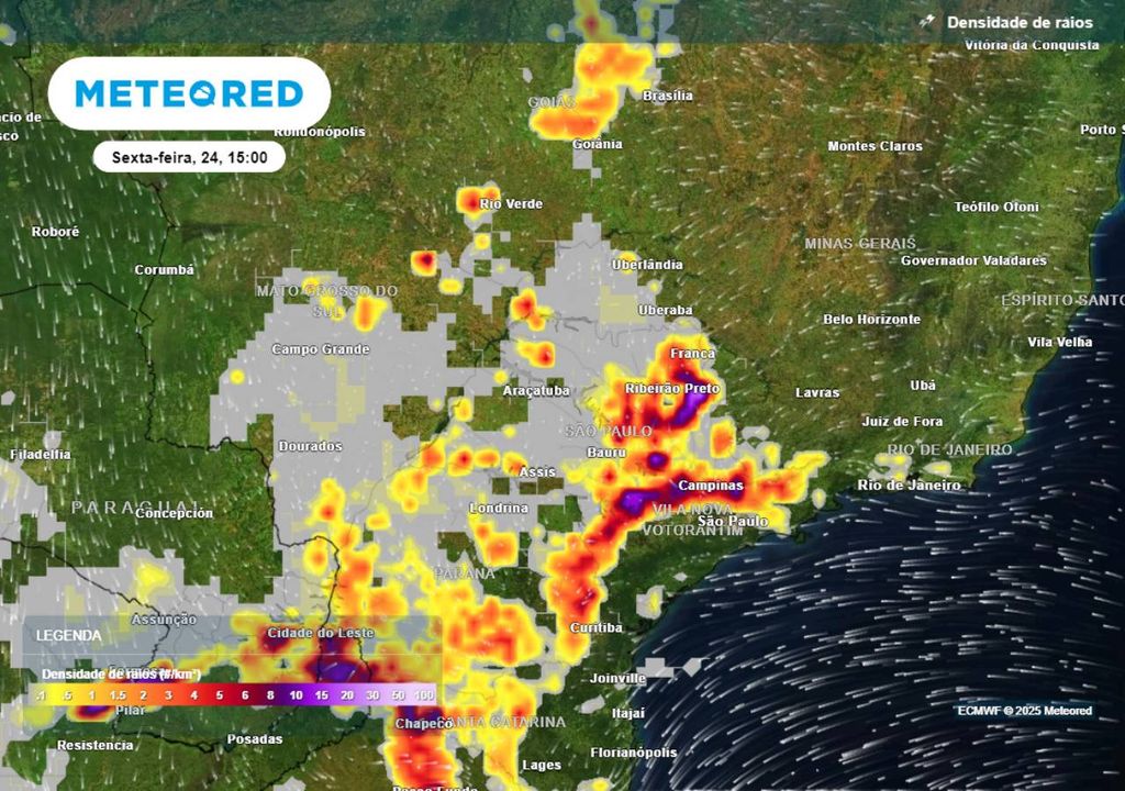 Com a permanência das altas temperaturas e do transporte de umidade do oceano, as instabilidades retornam na sexta-feira (24) no final da manhã na região leste do estado de São Paulo e no sul do Rio de Janeiro. Há riscos para chuvas intensas acompanhadas por tempestades nesta área paulista.