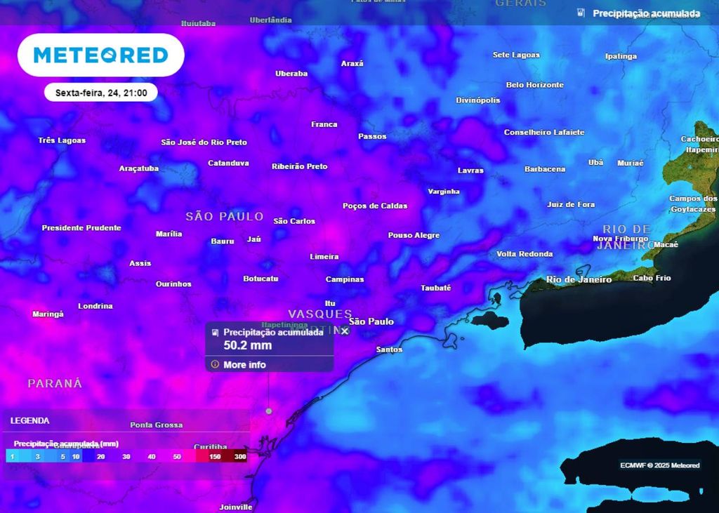 Conforme podemos observar no mapa de previsão abaixo, os acumulados totais de precipitação (em milímetros) até a noite de sexta-feira (24) não devem ultrapassar os 50 mm em São Paulo e 20 mm no Rio de Janeiro, com os maiores valores sendo observados no sudeste paulista.