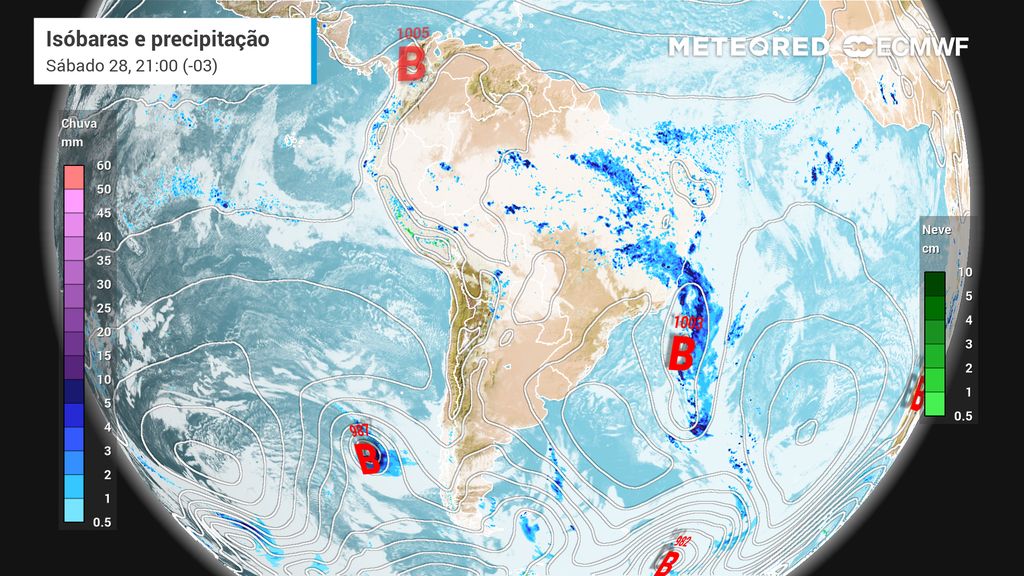 Ao mesmo tempo, os ventos de quadrante norte sul ajudam na redução das temperaturas em parte do Sul e do leste do Sudeste e, também, para o maior aporte de umidade, que ajuda na ocorrência de chuva no leste de São Paulo até o Rio de Janeiro.