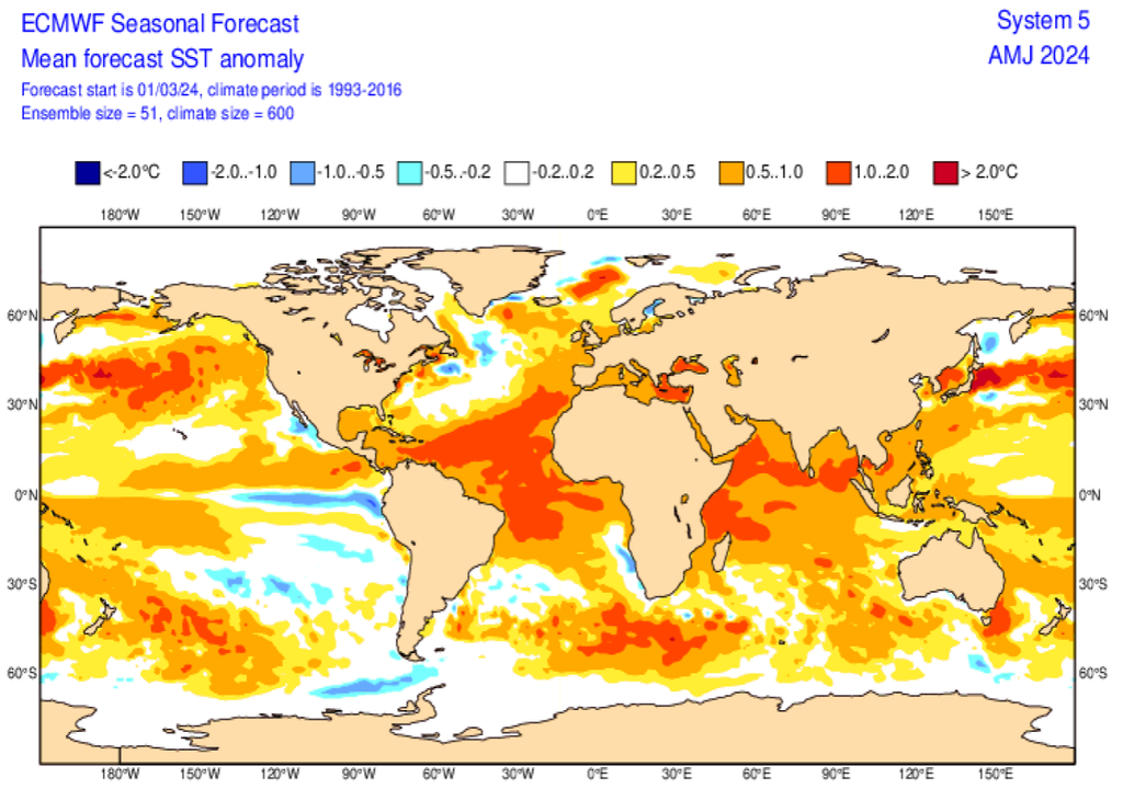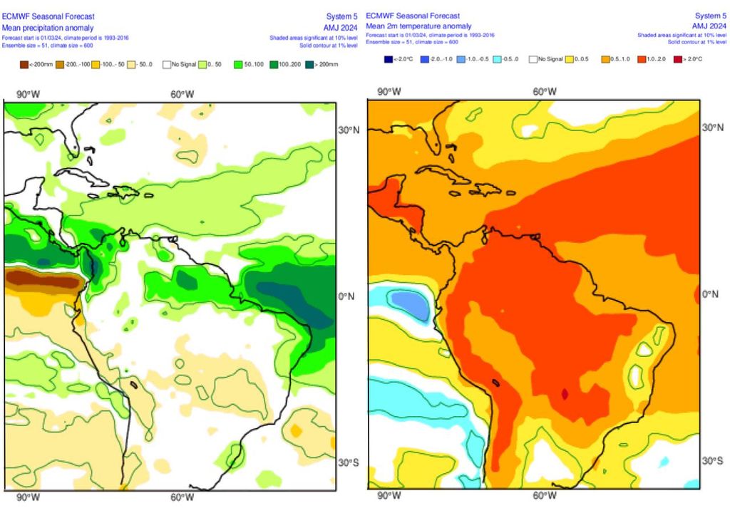 A previsão sazonal do modelo ECMWF para o trimestre de abril, maio e junho de 2024 indica uma tendência de temperaturas bem similar ao que estamos enfrentando nos últimos tempos, de temperaturas bem acima da normal climatológica em praticamente todo o Brasil, um reflexo dos efeitos do El Niño e combinada a tendência do aquecimento global registrado nos últimos anos. Apenas algumas regiões do país registrarão temperaturas mais próximas à média ou ligeiramente acima dela, como o caso da porção leste do Nordeste e porção sul da região Sul.