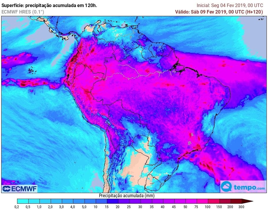 Nesta segunda-feira (04) o tempo fica instável desde o norte de Santa Catarina até a região Norte, com tempo firme ainda pela manhã no norte de Minas Gerais, no Espírito Santo, Bahia e em boa parte do Mato Grosso e do Mato Grosso do Sul. Na parte da tarde há previsão de chuva de moderada a forte intensidade no norte e oeste do Paraná, no estado de São Paulo, no Rio de Janeiro e na metade sul de Minas Gerais. No Centro-Oeste as chuvas ocorrem de forma muito isolada. No restante do país, as chuvas se mantêm volumosas no norte do Nordeste e da Região Norte.