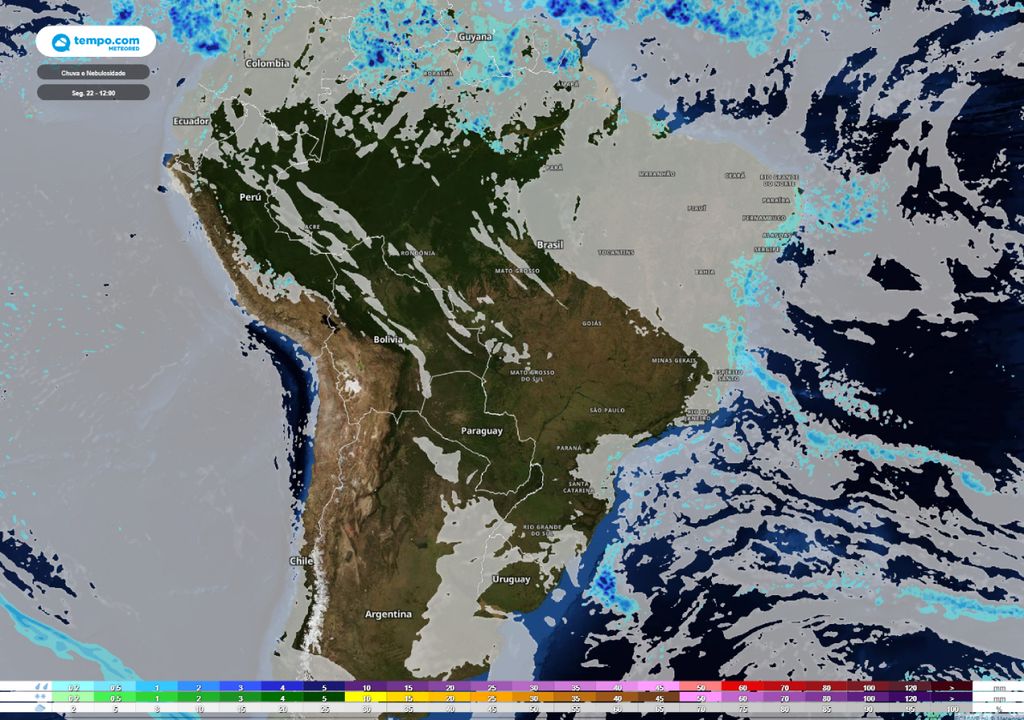 No restante do país o tempo segue com tempo firme, com precipitação de até forte intensidade ocorrendo somente no extremo norte.