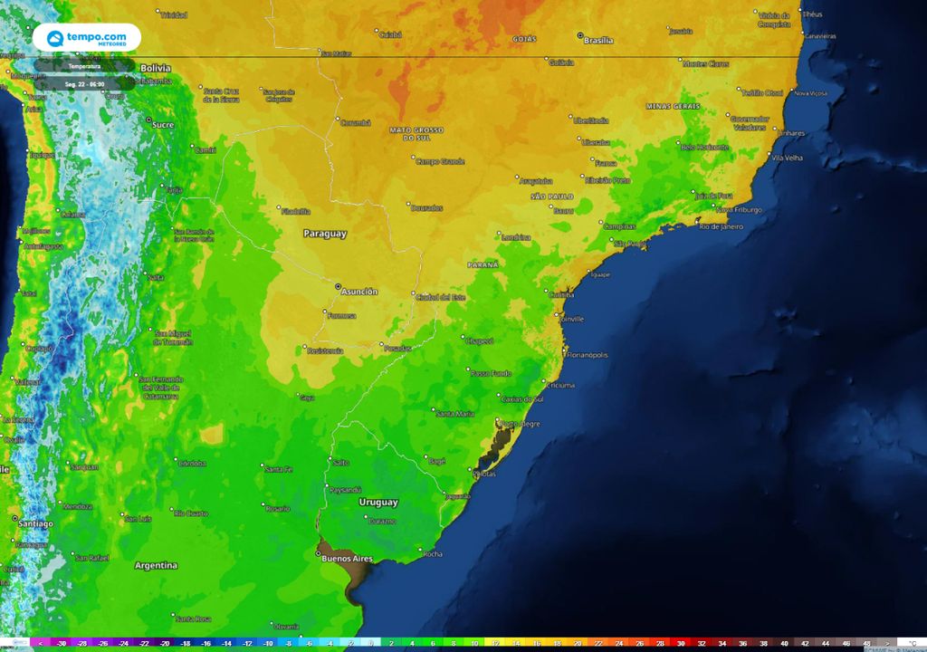 Quanto às temperaturas, o frio da madrugada e início da manhã se mantém em boa parte do país, porém no interior do país há previsão de calor ou até mesmo de temperaturas agradáveis. Frio ao longo do dia somente nas áreas mais ao sul, elevadas e do leste do país.