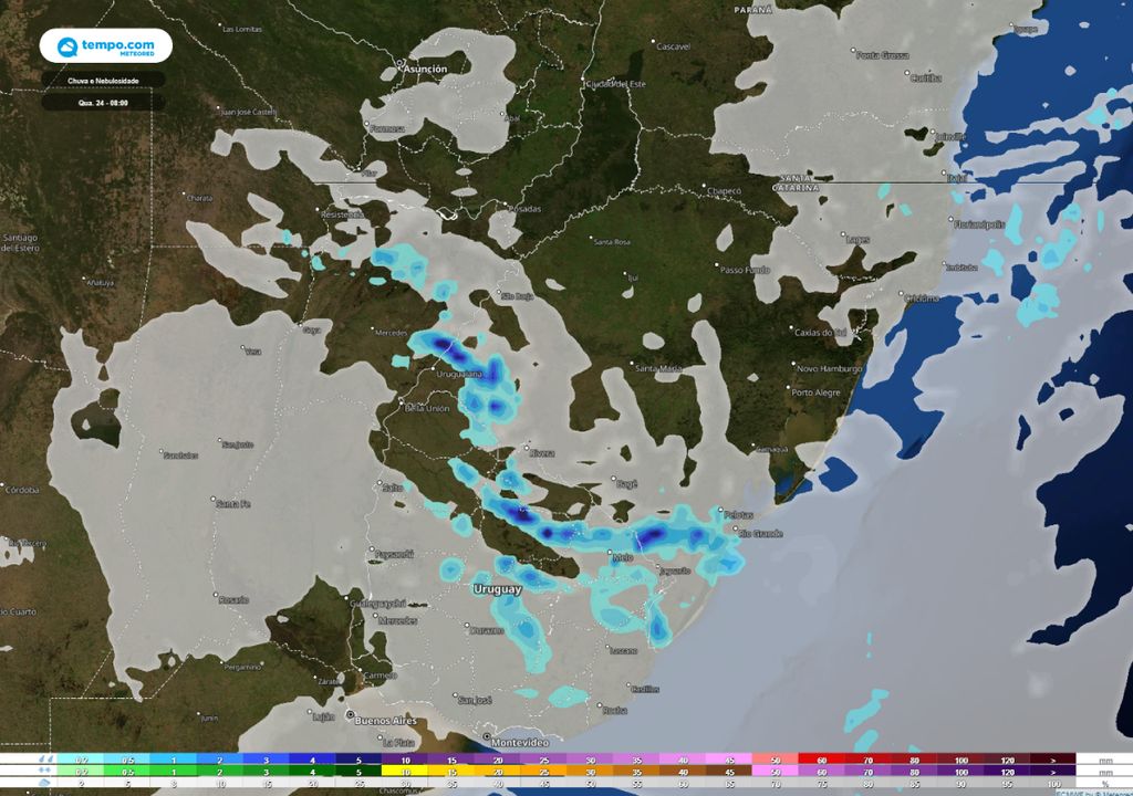 Na quarta-feira (24), o mesmo padrão é previsto, porém com menor possibilidade de chuva e com tempo firme no período da tarde para toda a faixa leste do país.