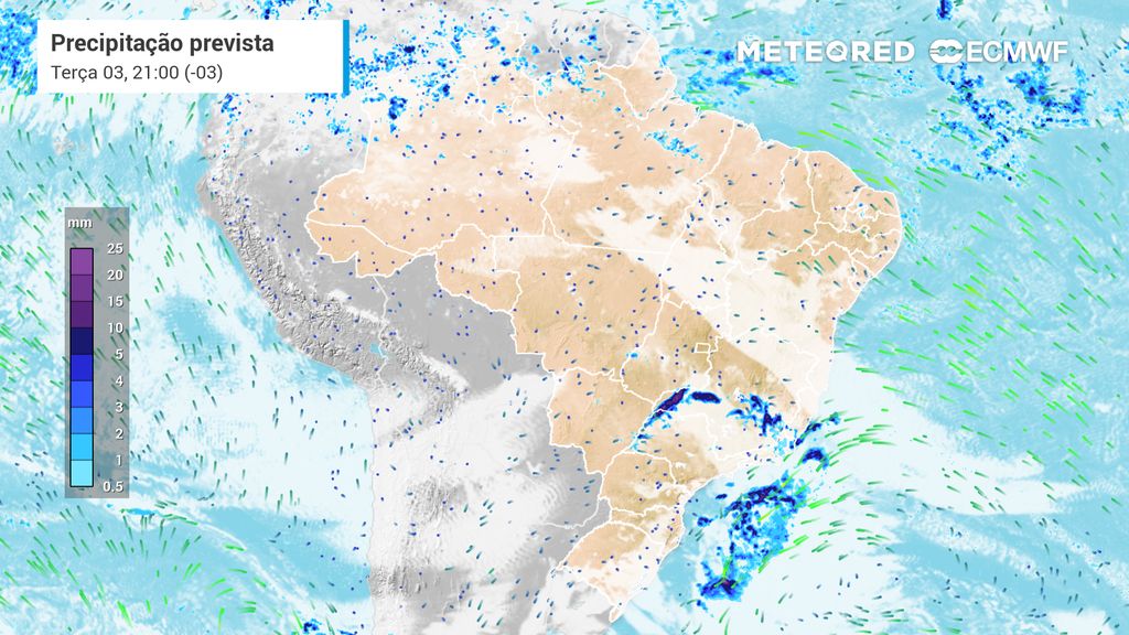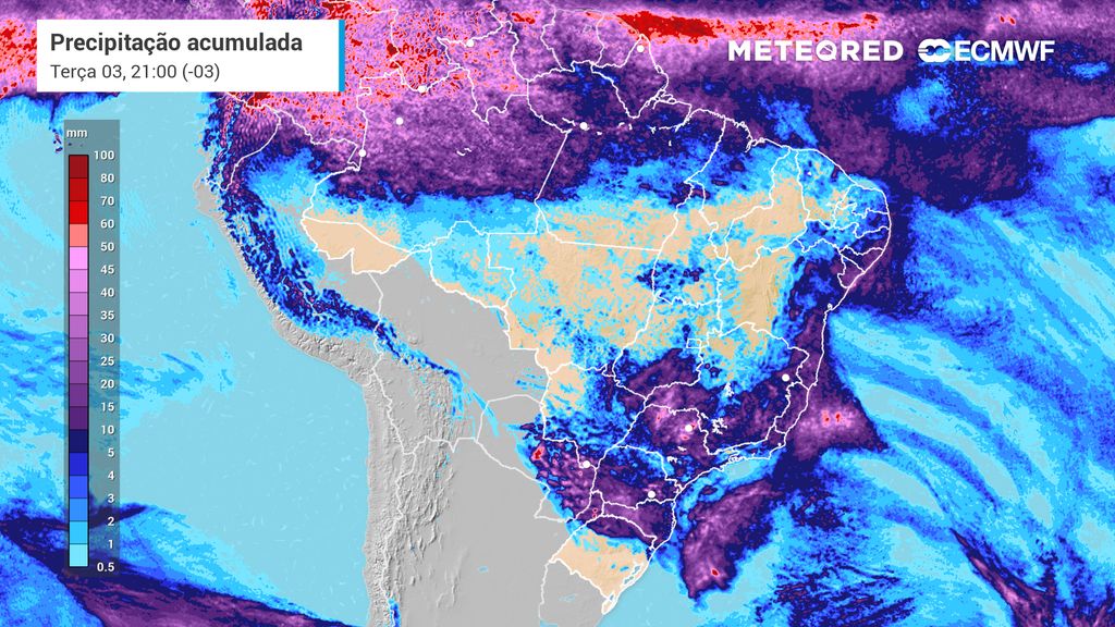 Na terça-feira (3), a massa de ar frio se afasta mais para o oceano. Assim, a região mais instável que vinha atuando entre o Paraguai e o centro-sul do Brasil consegue se deslocar mais pelo Brasil.