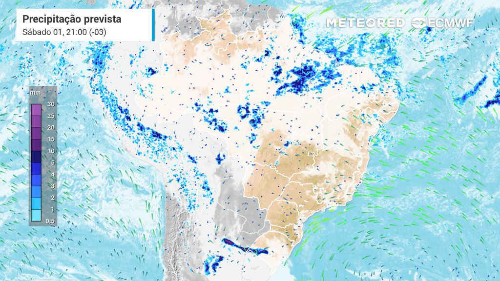 Um bloqueio atmosférico no Sudeste do Brasil mantém a maior parte dessa região com tempo seco. Ainda assim, existe um leve transporte de umidade que pode ocasionar chuvas rápidas e muito localizadas, especialmente em Minas Gerais, Espírito Santo, Rio de Janeiro e Bahia.