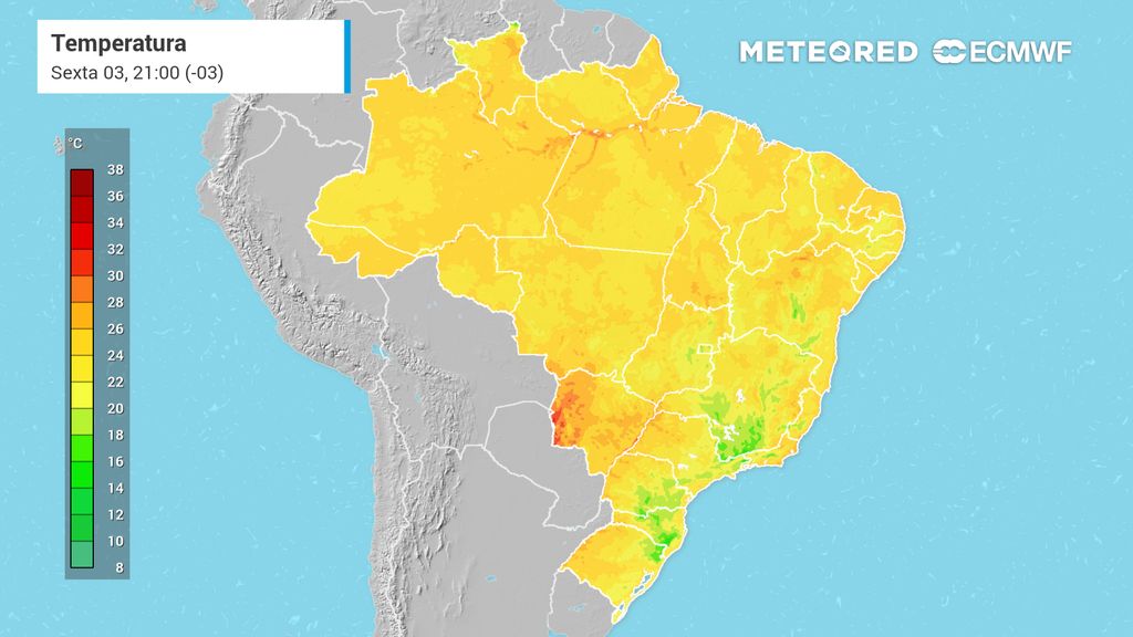 Nas regiões Norte e Nordeste, as mínimas ficam mais elevadas, variando geralmente entre 21 e 23°C, embora algumas áreas do sudeste da Bahia possam registrar valores um pouco menores.