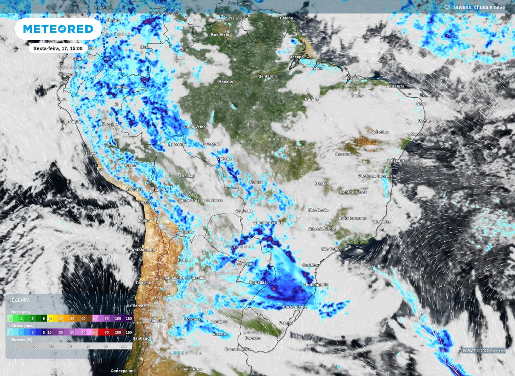 A sexta-feira (17) contará com a atmosfera saturada devido à chegada de ventos úmidos provenientes do norte do Brasil. O volume de água precipitável será mais elevado no oeste do Rio Grande do Sul e de Santa Catarina, além de localidades pontuais do Mato Grosso do Sul e do Mato Grosso.