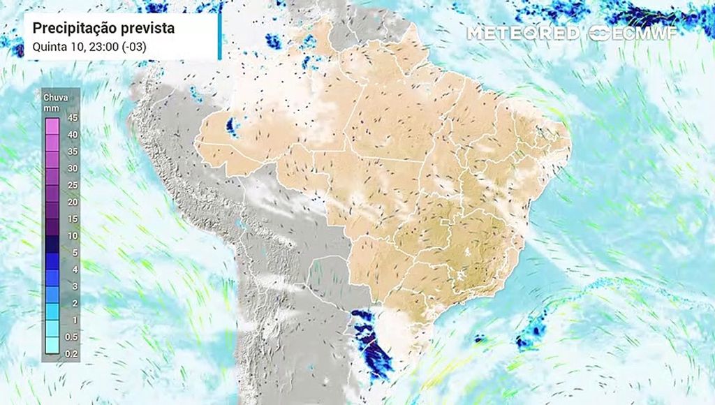 Durante o sábado (12), a frente fria causará chuvas na porção norte do Rio Grande do Sul, em Santa Catarina e também na porção sul do Paraná. Espera-se um total de 30 a 70 mm de chuva, com os maiores acumulados ocorrendo no oeste catarinense.