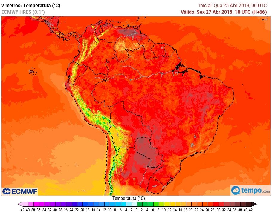 Na sexta-feira (26) nu00e3o hu00e1 grandes mudanu00e7as na previsu00e3o. A massa de ar seco ganha foru00e7a diminuindo o potencial de chuva no Centro-Oeste, Sudeste e Sul, contribuindo para o aumento das temperaturas. No Sul a sensau00e7u00e3o de calor u00e9 ainda maior devido u00e0 presenu00e7a de uma frente fria ao sul do Uruguai, que intensifica o transporte de ar mais quente para a Regiu00e3o e contribui para mu00e1ximas acima dos 30u00b0C na poru00e7u00e3o mais central do RS e no oeste dos estados do PR e de SC. Previsu00e3o de chuva somente no sul do estado gau00facho a partir da tarde.