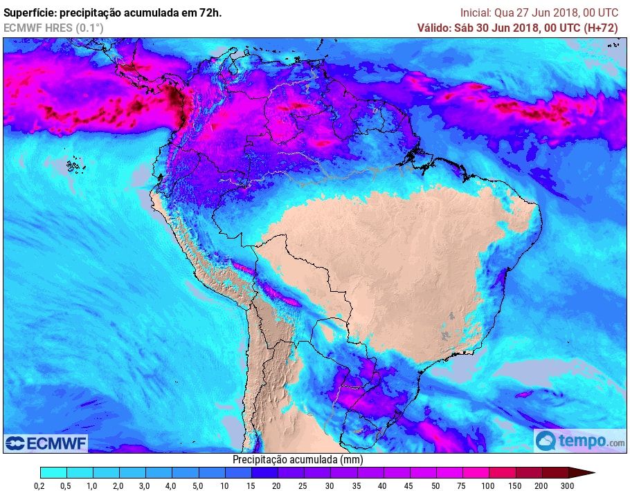 Nas demais regiões do país sem grandes mudanças nas condições do tempo. O que chama a atenção é o aumento da intensidade e abrangência das chuvas no leste do Nordeste, onde o tempo fica nublado em toda a faixa litorânea que vai do sul da BA até o Recife, com chuva ocorrendo de fraca a moderada intensidade ao longo do dia.