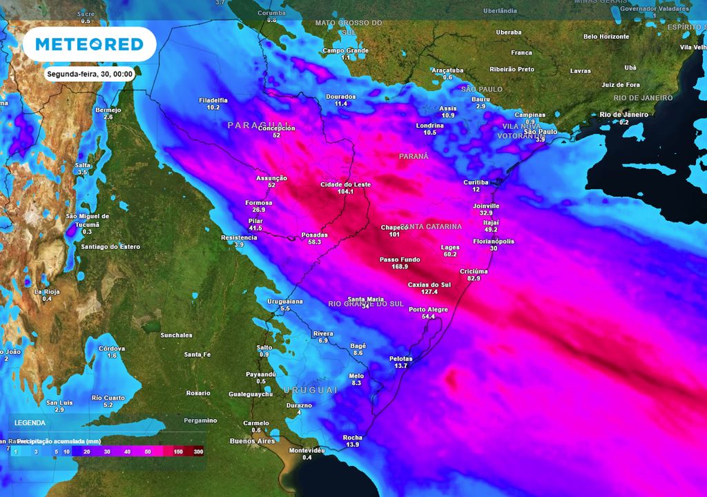 O sistema permanecerá relativamente estacionário sobre o Paraná na segunda-feira (30), causando chuvas moderadas em diversos municípios, inclusive a região metropolitana de Curitiba, o sul do Mato Grosso do Sul e no norte de Santa Catarina.