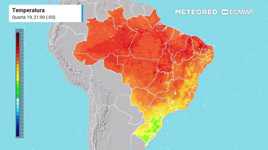 As temperaturas máximas já estão muito altas em alguns Estados, como Maranhão e Tocantins - que registraram, nesta quarta-feira (19), temperaturas de 38°C em Balsas e em Porto Nacional. Modelos de previsão indicam que temperaturas similares também serão registradas no Centro-Oeste, especialmente no Mato Grosso e no Mato Grosso do Sul.