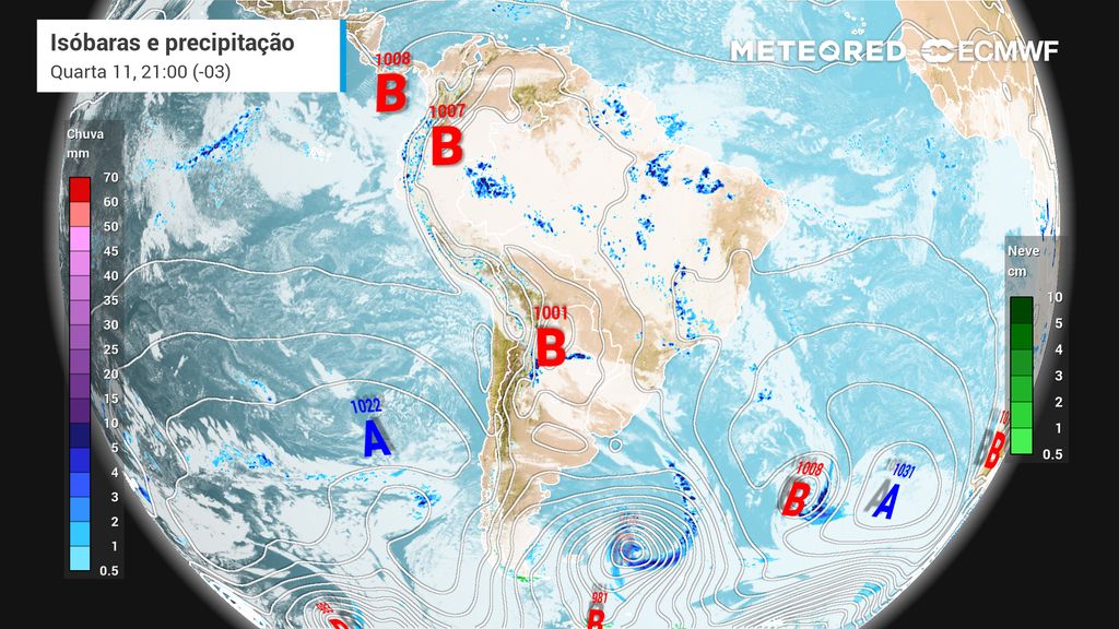 Nesta terça-feira (10), o cenário não será diferente. A ZCAS segue atuando com a presença de ventos que transportam umidade do leste do Amazonas em direção à faixa que se estende pelo Triângulo Mineiro, sul de Minas Gerais, norte e leste de São Paulo.