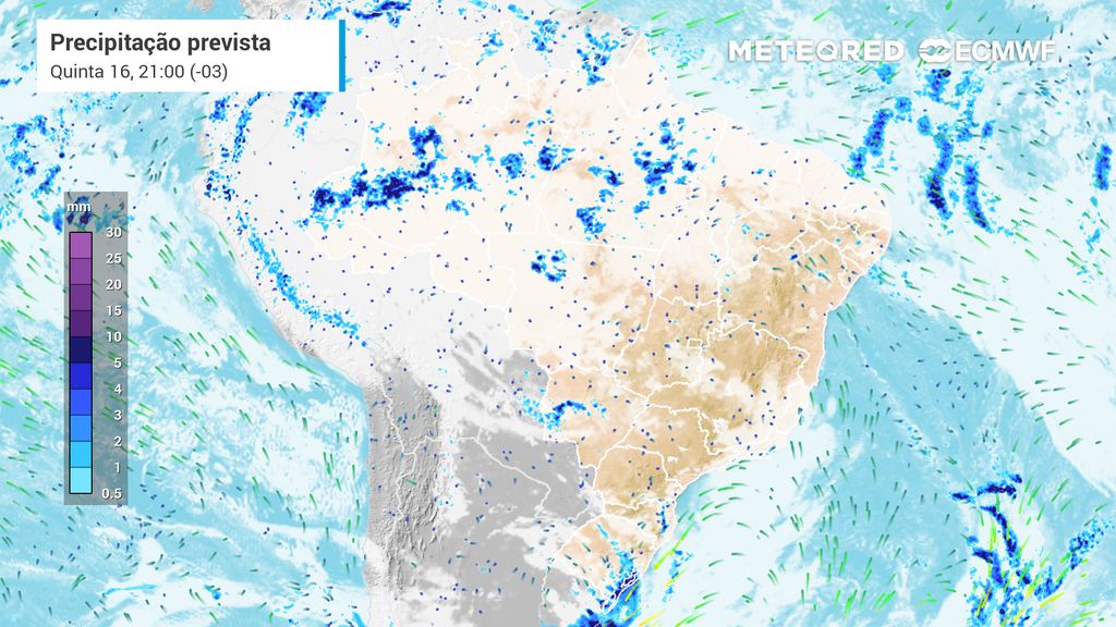 Ao longo das tardes, a ZCIT aumenta as instabilidades e são esperadas pancadas de chuva com intensidade moderada a forte e risco de temporais isolados no norte do Amazonas, centro-norte do Pará, no Amapá, no Maranhão e no norte do Piauí, do Ceará e do Rio Grande do Norte.